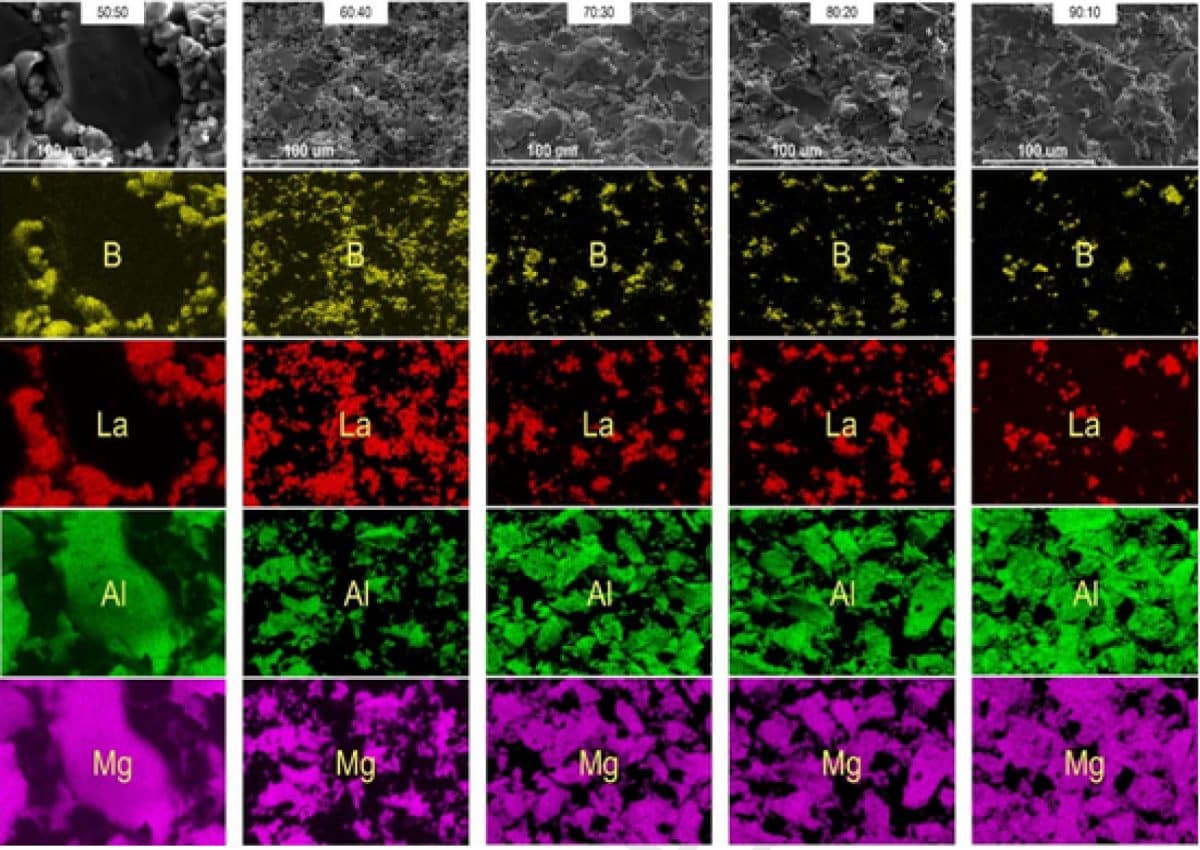 В статье коллектива Сахалинского государственного университета, Дальневосточного федерального университета, Томского политехнического университета и Института химии и технологии редких элементов и минерального сырья Кольского научного центра РАН, опубликованной в научном журнале Materials Characterisation, рассказывается о разработке композитов на основе порошков гексаборида лантана (LaB₆) и алюминиево-магниевого сплава (Al—Mg), смешанных в различных соотношениях. Эти смеси подвергли плазменному спеканию при температуре 400 °C и давлении 21,5 МПа и выдержали пять минут в вакууме. В результате получили плотные двухфазные материалы, состоящие из LaB₆ и интерметаллида Mg₂Al₃, которые сочетают структурную прочность металлической матрицы с эффективным поглощением тепловых нейтронов за счет высокого содержания бора в LaB₆.