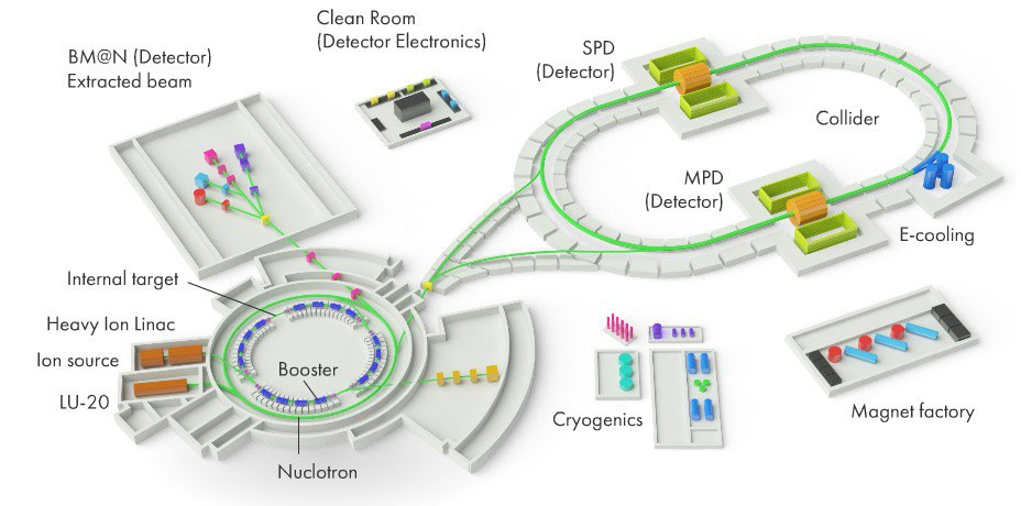 В ней будут сталкиваться друг с другом пучки ионов. Чем более сфокусированный и плотный пучок, тем эффективнее будут столкновения. Сжать пучок позволяет система электронного охлаждения, созданная специалистами ИЯФ СО РАН. Холодные электроны инжектируются к ионам, забирают у них часть тепловой энергии, в результате чего пучок сжимается. В 2025 г. физики ОИЯИ и ИЯФ СО РАН продемонстрировали многократную инжекцию в продольном фазовом пространстве с использованием электронного охлаждения. В результате интенсивность пучка была увеличена до 6 раз.
