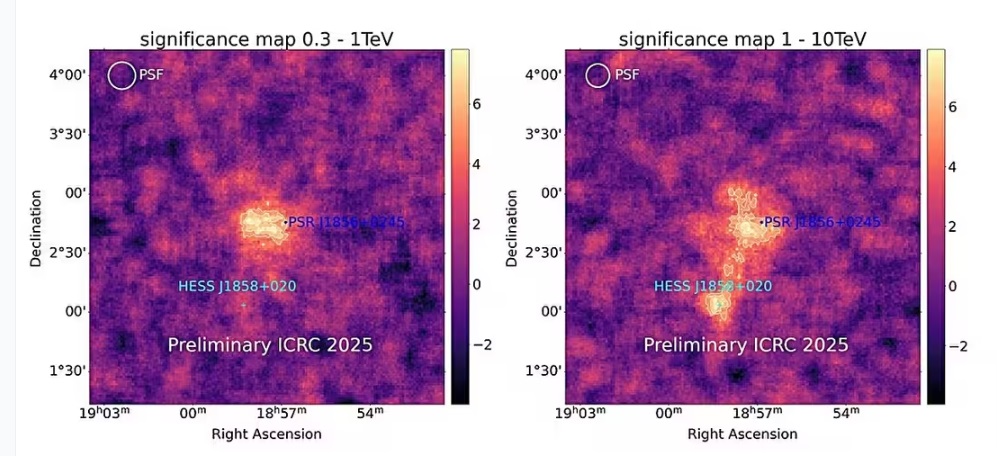 Согласно статье, карта значимости области вокруг HESS J1857+026 в диапазонах 0,3–1 ТэВ и 1–10 ТэВ показывает, что пульсар PSR J1856+0245 явно смещён относительно центра VHE-излучения. Это подтверждает предыдущие предположения о том, что гамма-излучение, наблюдаемое от HESS J1857+026, потенциально создаётся туманностью пульсарного ветра (PWN), питаемой PSR J1856+0245. Туманность пульсарного ветра – это туманность, образующаяся из частиц, разогнанных вращающимся пульсаром до релятивистских скоростей.