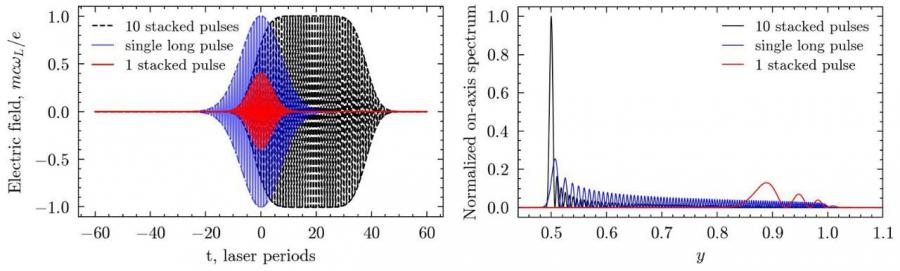 Сравнение разных форм лазерного импульса и их воздействия на излучение. Слева показано, как выглядит во времени электрическое поле при стыковке (суммировании) 10 коротких гауссовых импульсов по сравнению с одним коротким импульсом и одиночным гауссовым импульсом той же амплитуды и полной энергии, что стыкованный импульс. Справа — соответствующие нормированные спектры обратного комптоновского рассеяния: видно, как выбор структуры импульса меняет распределение энергии излучения