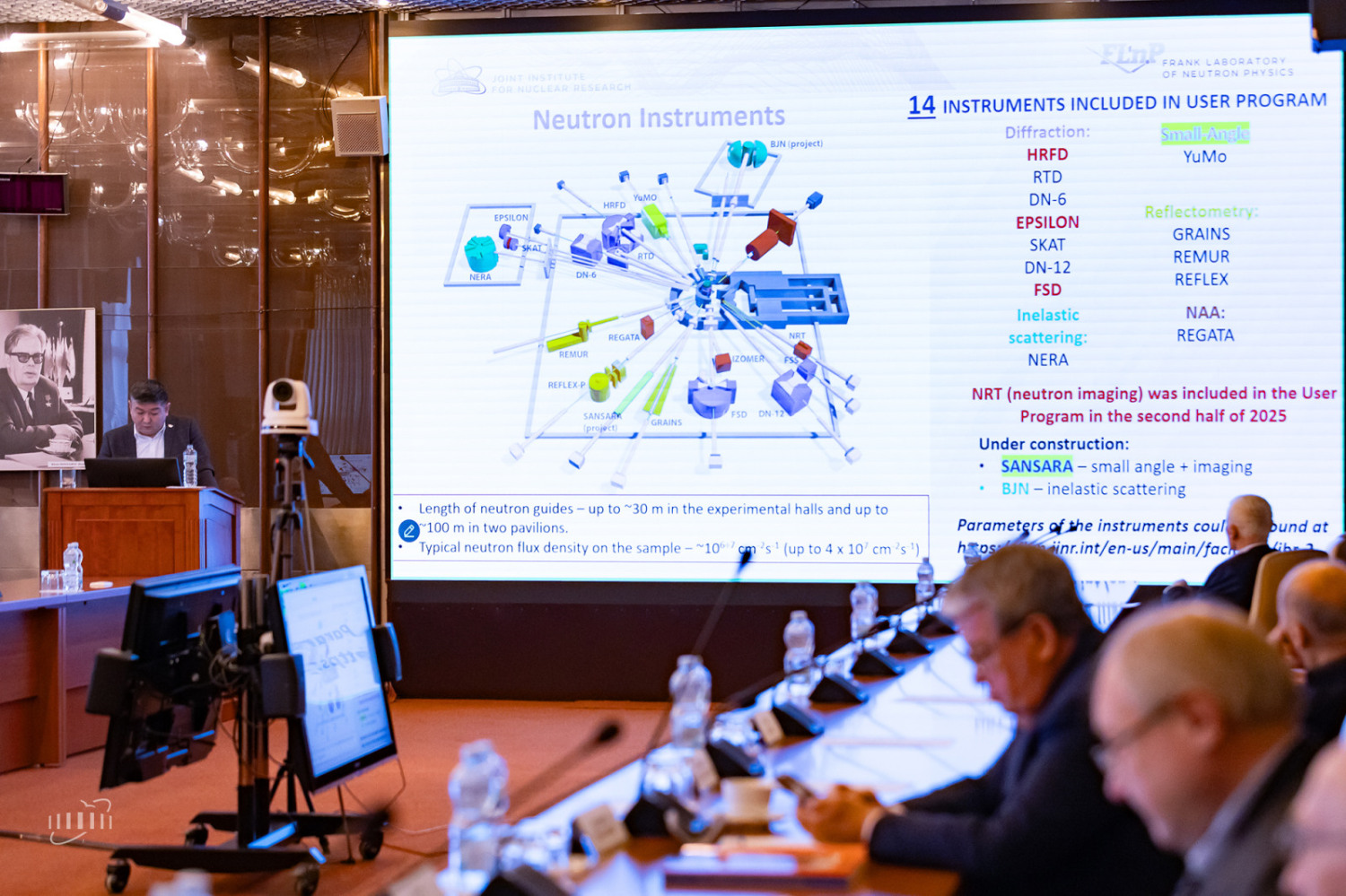 С докладом о планах развития комплекса спектрометров реактора ИБР-2 в 2026–2030 годах выступил начальник отдела ЛНФ Денис Козленко. Он рассказал о направлениях модернизации существующих спектрометров и о создании новых установок. На сегодня комплекс спектрометров реактора ИБР-2 включает 14 установок для исследований конденсированных сред – 8 дифрактометров, 3 рефлектометра, спектрометр малоуглового рассеяния, спектрометр неупругого рассеяния и спектрометр нейтронной радиографии и томографии.