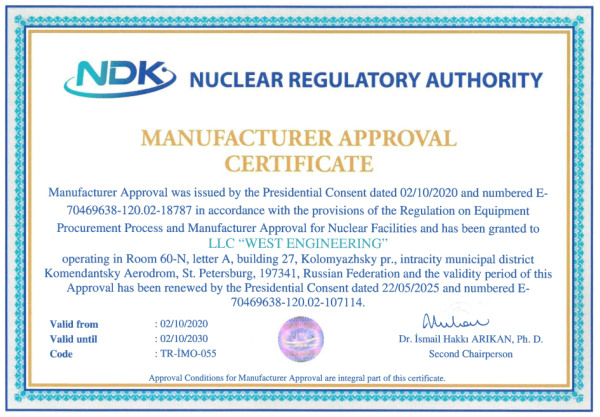 Агентство по ядерному регулированию Турции (NDK) расширило область действия сертификата, выданного «Вест-Инжиниринг», на обособленное подразделение «Мурино». Решение было принято на основании результата аудита, а также по итогам рассмотрения представленного комплекта документов.