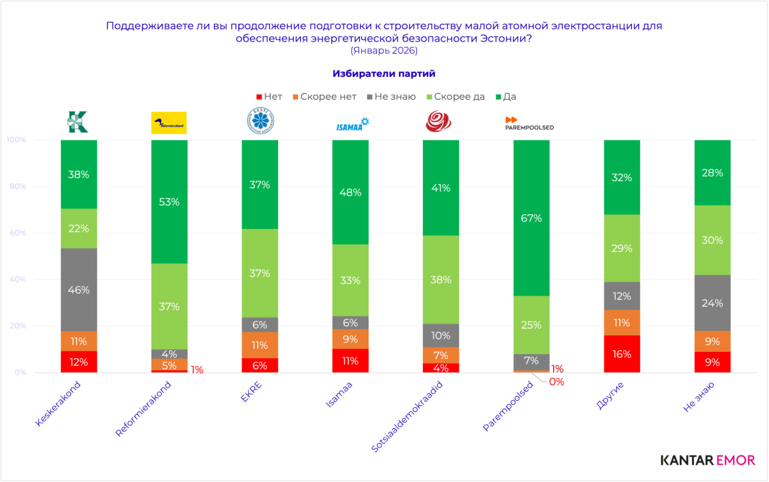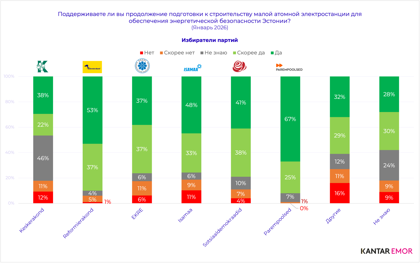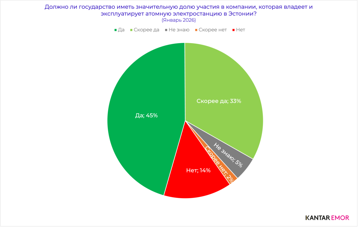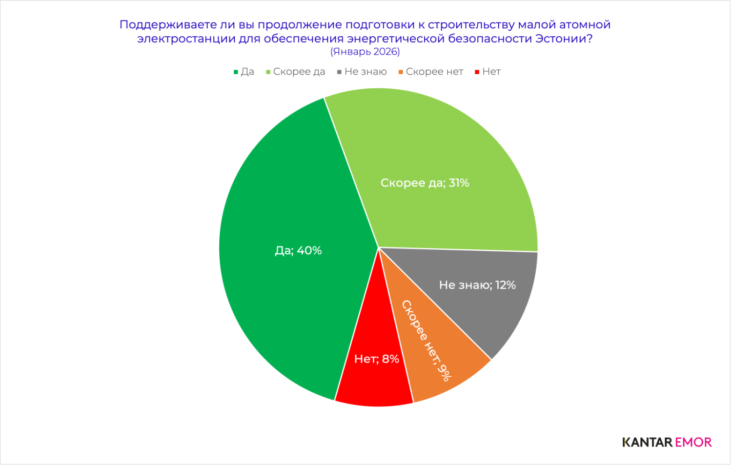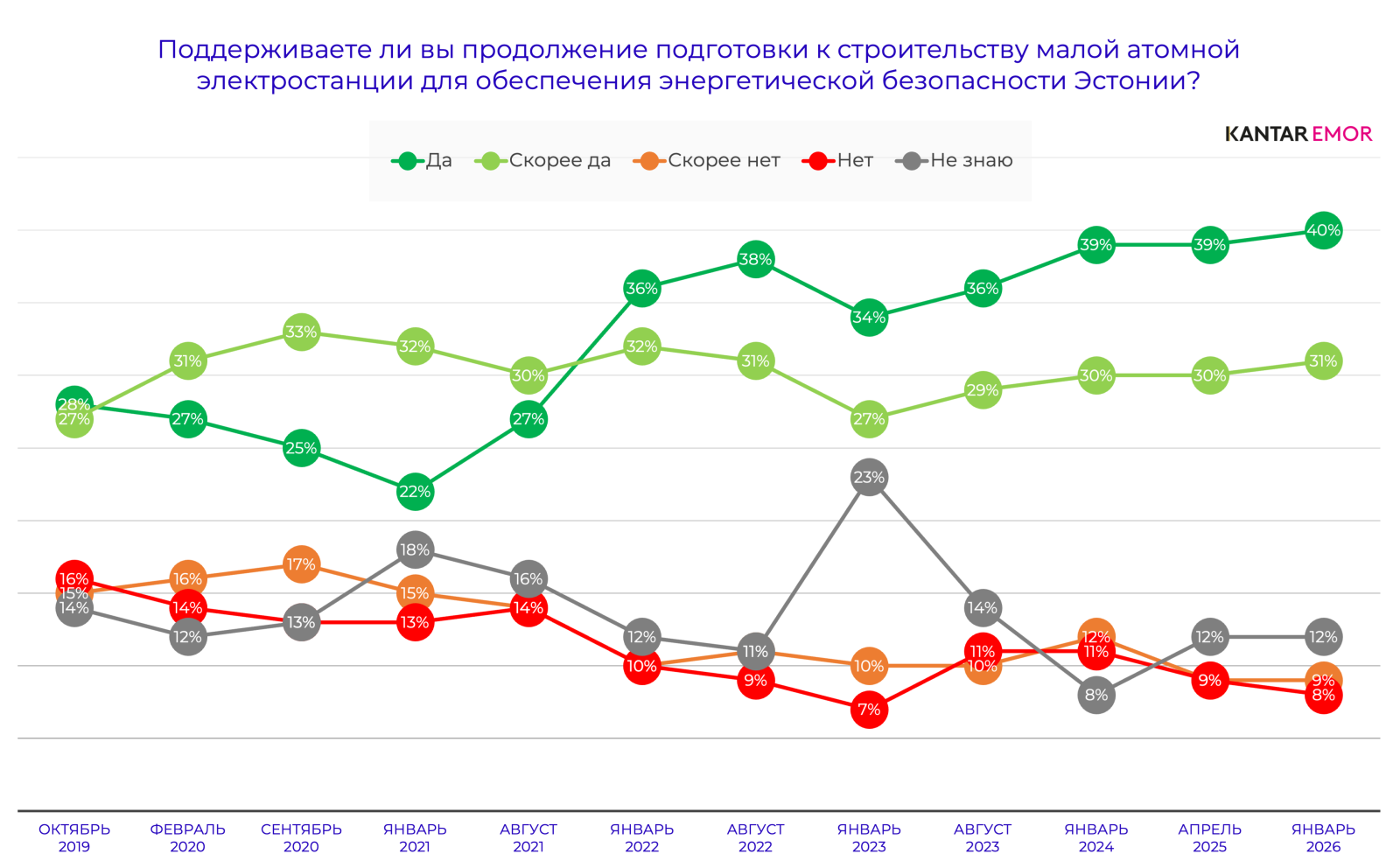 Согласно исследованию, проведенному Kantar Emor в январе 2025 года, 71% респондентов поддерживает или скорее поддерживает продолжение подготовки к строительству атомной электростанции нового поколения. По сравнению с предыдущим исследованием, проводившимся в апреле 2025 года, поддержка внедрения атомной энергетики выросла, и сегодня она является самой высокой за все время проведения опросов начиная с 2019 года. При этом доля противников атомной энергетики продолжает снижаться. По данным свежего опроса, против развития атомной энергетики выступают 17% респондентов, причем убежденные противники (8%) и склоняющиеся против (9%) распределились почти поровну. Четкой позиции не смогли выразить 12% опрошенных.