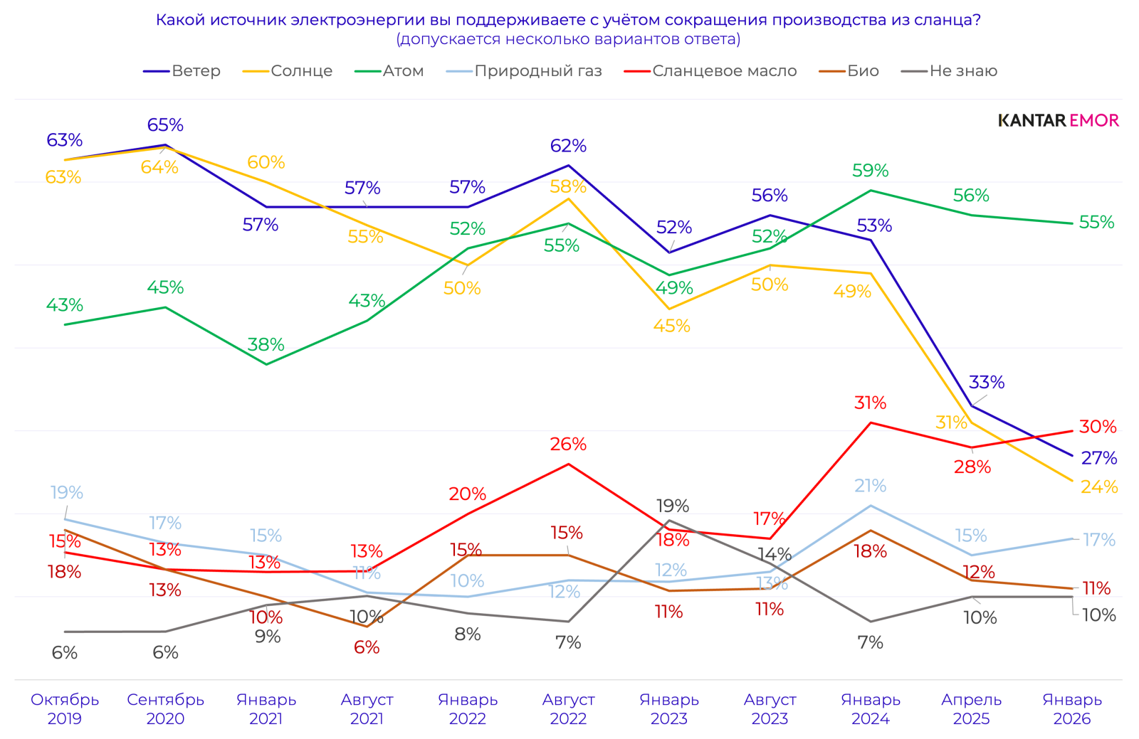 Атомную энергетику жители Эстонии по-прежнему считают наиболее предпочтительным направлением развития энергетики. На вопрос: «Какой вид производства электроэнергии, по вашему мнению, следует развивать в Эстонии с учетом сокращения производства электроэнергии из сланца?» 58% респондентов ответили, что, по их мнению, в Эстонии необходимо построить малую атомную электростанцию нового поколения. По сравнению с прошлым годом заметно снизилась популярность ветровой и солнечной энергетики. Развитие ветроэнергетики поддерживают 30% респондентов, а солнечной энергетики – 29%, что значительно ниже показателей годичной давности. В то же время выросла поддержка производства электроэнергии из сланца в связке с производством сланцевого масла: этот вариант считают достойным развития 32% опрошенных.