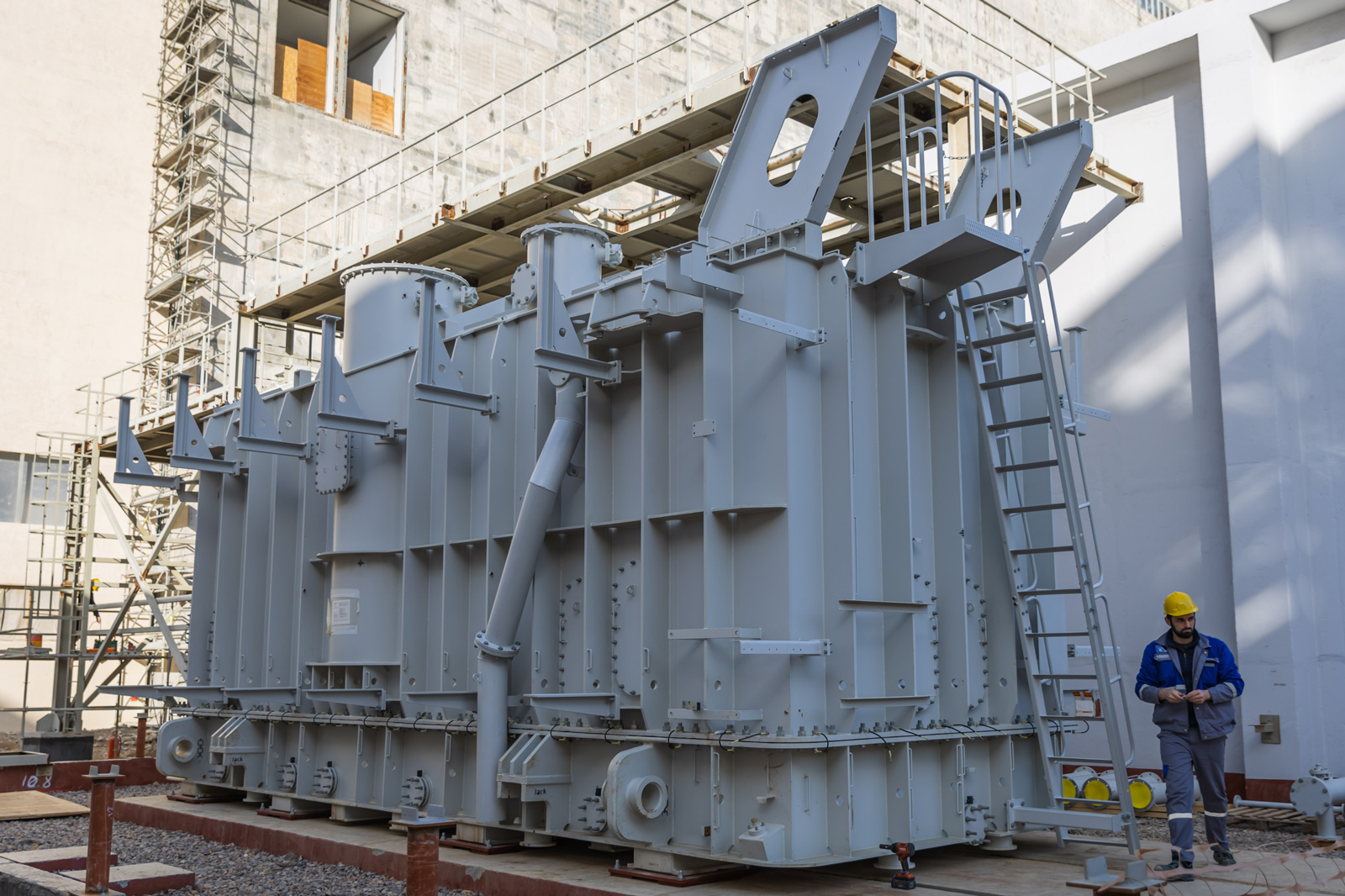 До этого на площадке были выполнены подготовительные мероприятия, включая устройство фундаментов, монтаж заземления, возведение огнепреградительных перегородок, подведение строительных конструкций токопроводов 24 и 400 кВ, а также оборудование систем пожаротушения. На предстоящем этапе в зоне установки трансформаторов будет выполнен монтаж навесного оборудования, подключение токопроводов, монтаж и наладка систем управления, защиты и автоматического пожаротушения.