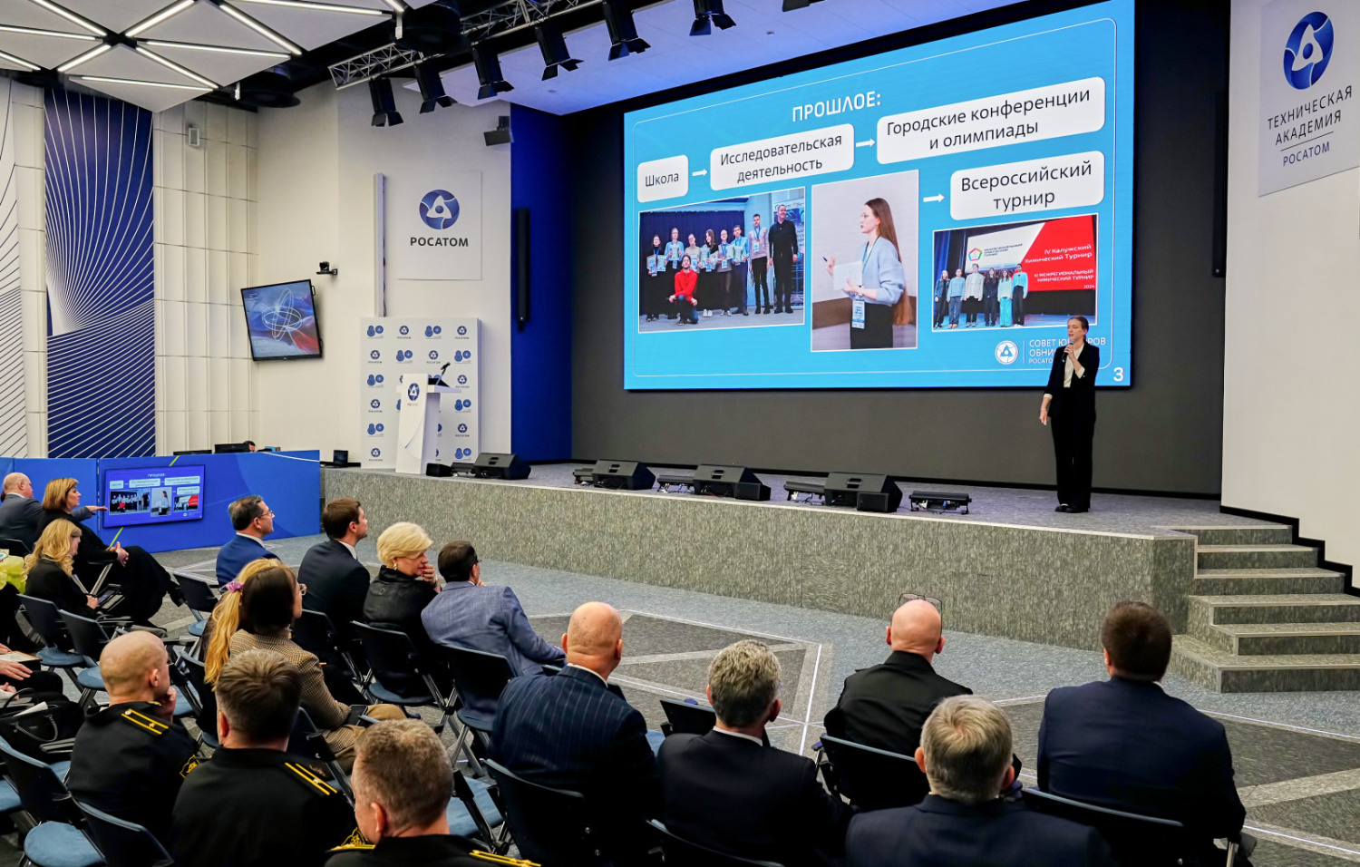 Торжественная часть плавно перешла в сессию научно-практических докладов «Прошлое, настоящее и будущее: человек – главный научный потенциал», где руководители ключевых предприятий и учреждений Обнинска представили историю, современные достижения и стратегические планы своих организаций.