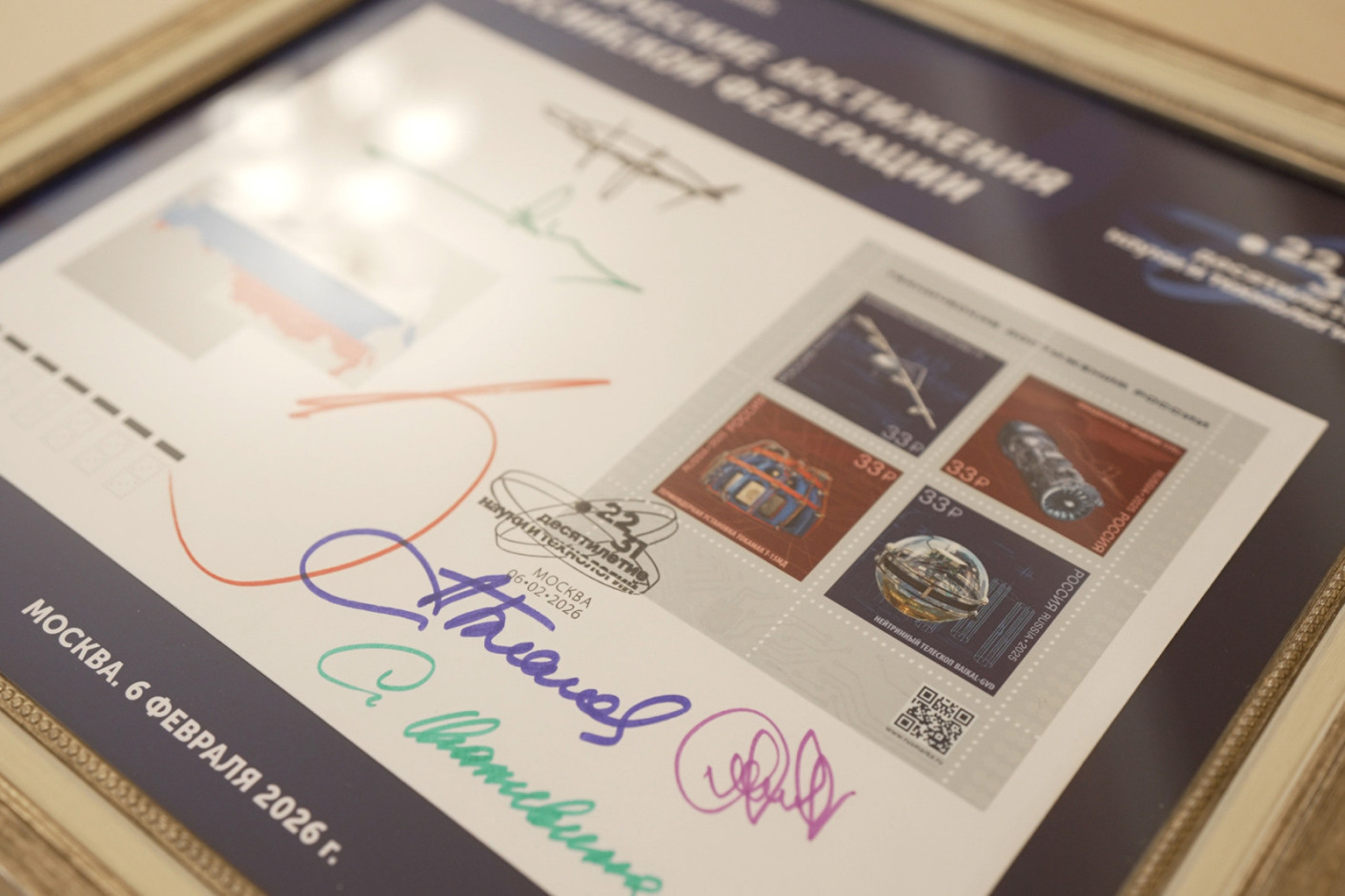 В преддверии Дня российской науки и в рамках Десятилетия науки и технологий, 6 февраля 2026 года в Министерстве науки и высшего образования РФ состоялась торжественная церемония гашения почтовых марок. Новая серия посвящена ключевым техническим достижениям науки и промышленности России. Одним из центральных образов новых марок стал флагманский проект Объединенного института ядерных исследований Baikal-GVD.