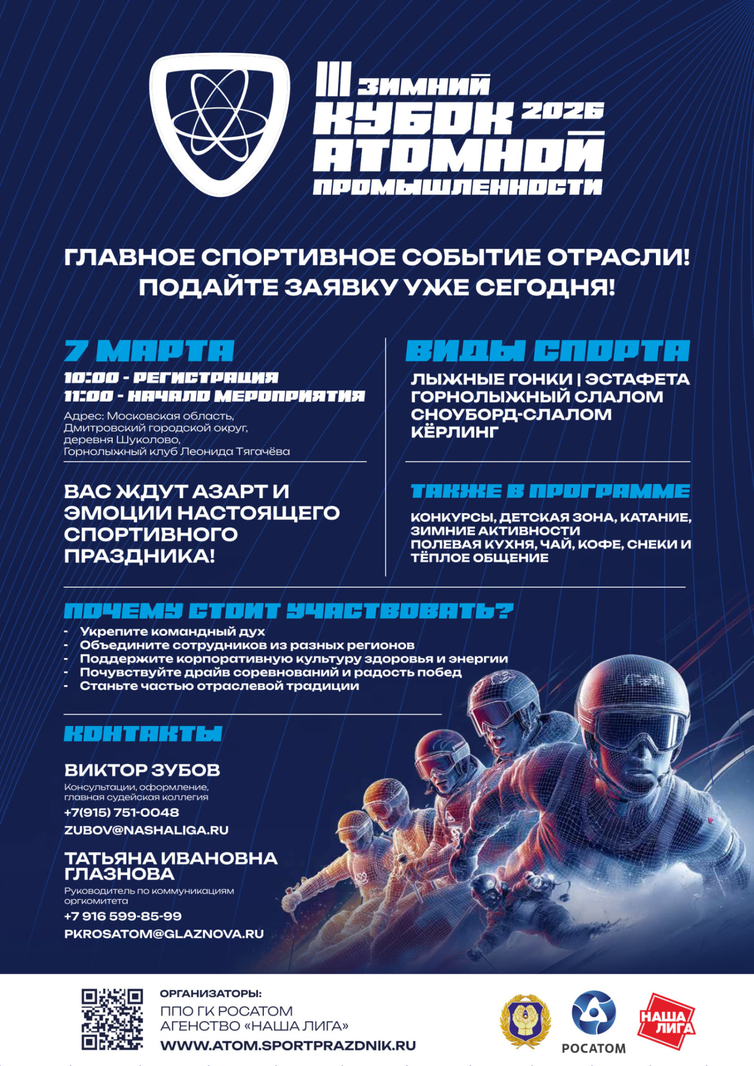 ППО ГК РОСАТОМ приглашает вашу команду присоединиться к III-му «Зимнему Кубку Атомной Промышленности», который пройдёт 7 марта 2026 года! Это уникальное корпоративное спортивное событие: лыжные гонки, сноуборд-слалом, горные лыжи, кёрлинг — и специальная развлекательная зона для болельщиков и детей.