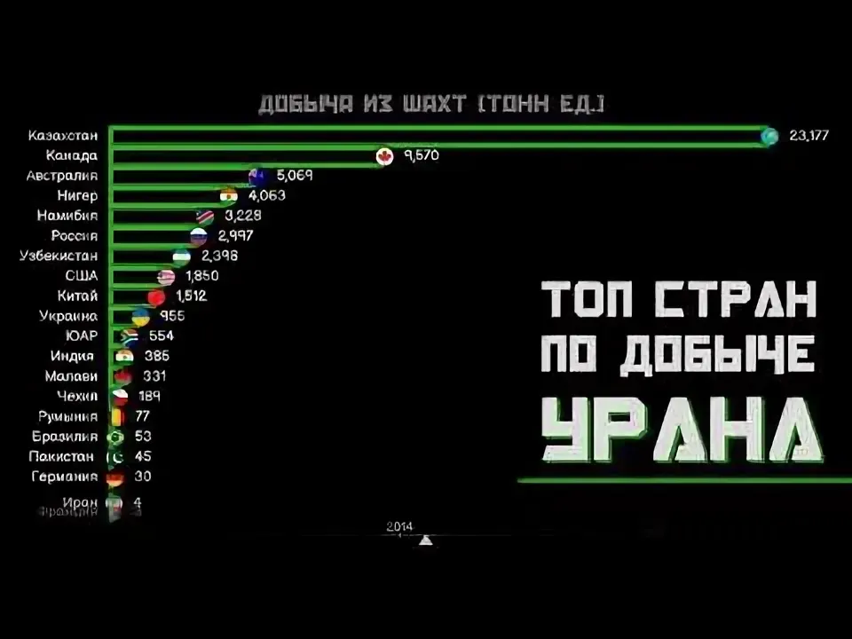 По последним данным WNA, в 2024 году три четверти мирового объема добычи урана обеспечивали три страны: Казахстан, Канада и Намибия, которые произвели 23 270 т (39%), 14 309 т (24%) т и 7333 т (12%) соответственно. Узбекистан находился на пятой позиции (4000 т, 6,6%), а Россия, добывшая 2738 т, — на шестой. Ее доля в мировой добыче составила 4,5%. Всего же в мире, по данным WNA, в 2024 году было произведено 60 213 т продукции в пересчете на чистый уран, или 71 006 т в виде закиси-окиси урана (U3O8) — эталонной формы, используемой для установления цен на минерал и различных операций с ним.