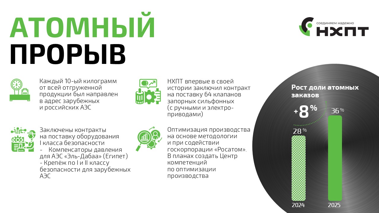 Основным драйвером роста стало укрепление позиций в технологически сложных отраслях. Доля поставок для атомной промышленности выросла до 36% (в 2024 году — 28%). Среди значимых проектов — заключение контракта на поставку крепежа 1-го класса безопасности для АЭС «Эль-Дабаа» в Египте, а также контракт на поставку 64 запорных сильфонных клапанов.