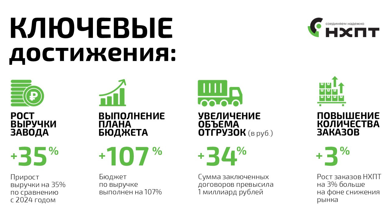 Завод «НефтеХимПромТорг» (НХПТ) опубликовал финансовые и производственные результаты за 2025 год. Годовая выручка предприятия впервые превысила 1 миллиард рублей без НДС, показав рост на 35% относительно 2024 года. При этом, несмотря на общую тенденцию к снижению заказов на рынке соединительных деталей, завод увеличил их количество на 3%.