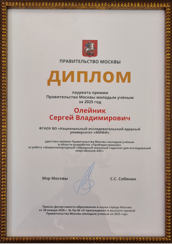 Мэр Москвы Сергей Собянин вручил молодым учёным премии Правительства Москвы за научные достижения в естественных, технических и гуманитарных науках. Среди награжденных - начальник отдела экономического анализа и сопровождения перспективных проектов развития АО «ВНИИАЭС» (Электроэнергетический дивизион госкорпорации «Росатом») Сергей Олейник. Вместе с коллегами из МИФИ он победил в номинации «Приборостроение» с работой «Широкоапертурный гибридный мюонный годоскоп для исследований энергоблоков АЭС».
