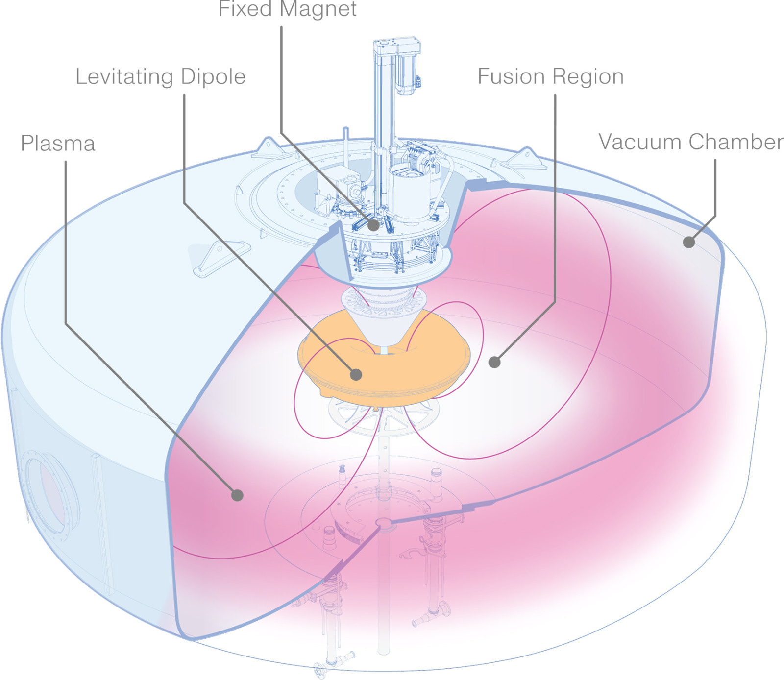 Более традиционные термоядерные установки, такие как токамаки и стеллараторы, используют множество сверхпроводящих магнитов для создания сложного магнитного поля. В отличие от них, левитирующий диполь использует один магнит для удержания плазмы в гораздо более простой конфигурации. В сердце установки находится мощный магнит, свободно парящий в вакуумной камере и удерживаемый в таком положении другим магнитом, расположенным над ним. Левитация необходима для удержания плазмы вокруг магнита, что означает отсутствие опорных конструкций, взаимодействующих с перегретым газом. Это делает конструкцию потенциально более простой, дешевой и легкой в обслуживании по сравнению с традиционными подходами.