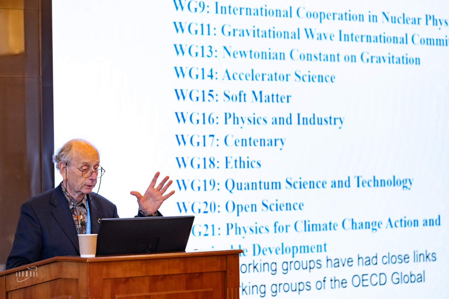 Мишель Спиро, паст-президент Международного союза чистой и прикладной физики (IUPAP) рассказал участникам заседания о ключевых инициативах в рамках провозглашенного ООН Международного десятилетия наук в интересах устойчивого развития (2024–2033).