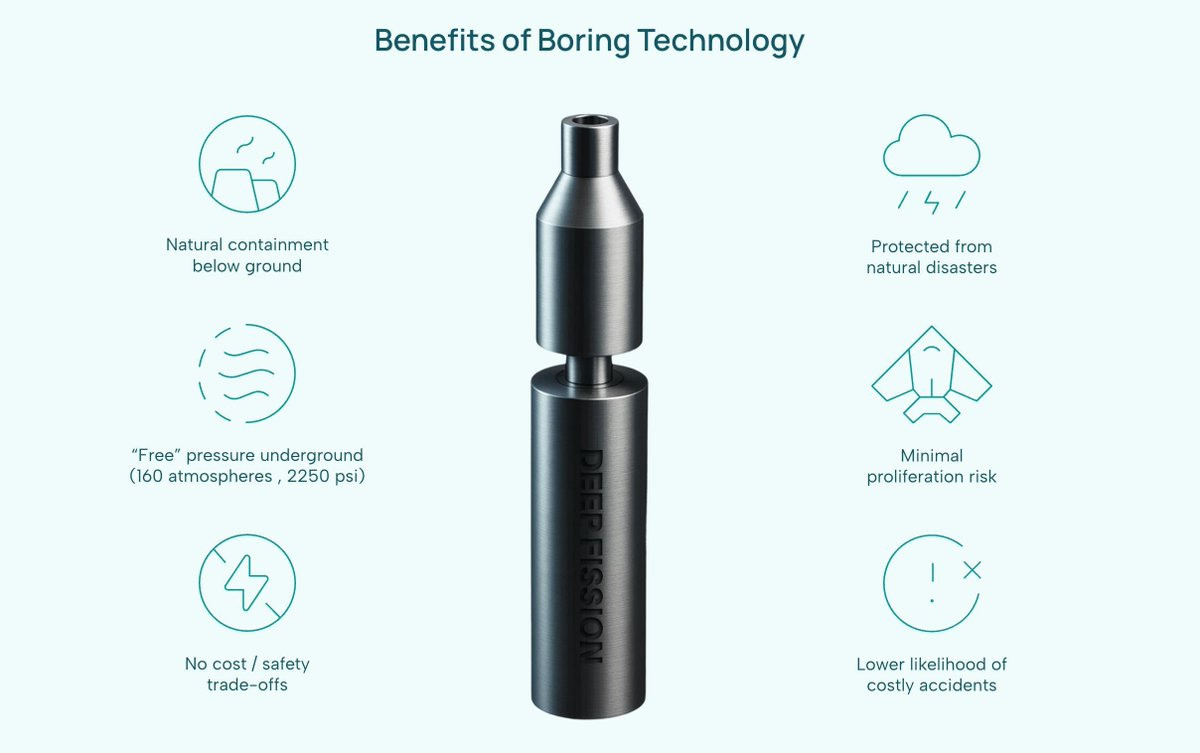 Реактор Gravity стартапа Deep Fission представляет собой малый модульный реактор (ММР), предназначенный для размещения под землей в оптимизированной скважине глубиной одна миля (1,6 км). По заявлению компании, каждый реактор, использующий традиционную технологию водо-водяного реактора и топливо из низкообогащенного урана, будет генерировать 15 МВт(э), а его малая площадь и высокая плотность мощности означают, что для него потребуется лишь часть земли, необходимой для традиционной наземной атомной станции: десять реакторов на одной площадке обеспечат 150 МВт(э), а 100 реакторов будут производить 1,5 ГВт(э). Пассивная защита и естественная изоляция, обеспечиваемые окружающей геологией, а также сочетание проверенных технологий из ядерной, нефтегазовой и геотермальной отраслей с использованием стандартных компонентов и легкодоступного НОУ-топлива направлены на повышение безопасности и защищенности, а также на обеспечение более быстрого и экономически эффективного пути к развертыванию технологии.