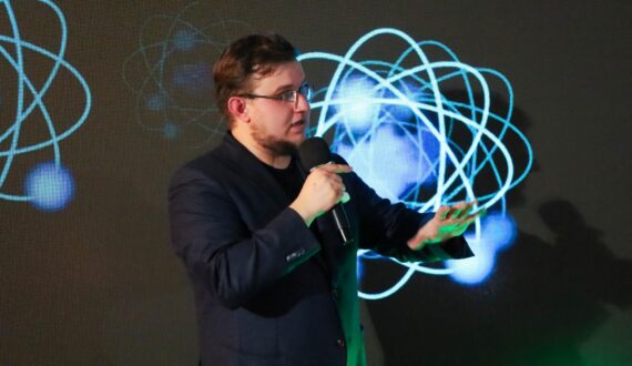 Вторым событием вечера стало научно-популярное шоу «Science Sound». Спикером выступил заведующий музеем изобразительного искусства XX–XXI вв. (филиал Ульяновского областного художественного музея) Владислав Соловьёв. Под аккомпанемент гитары музыканта Андрея Архипова он прочёл лекцию «Атом в искусстве».