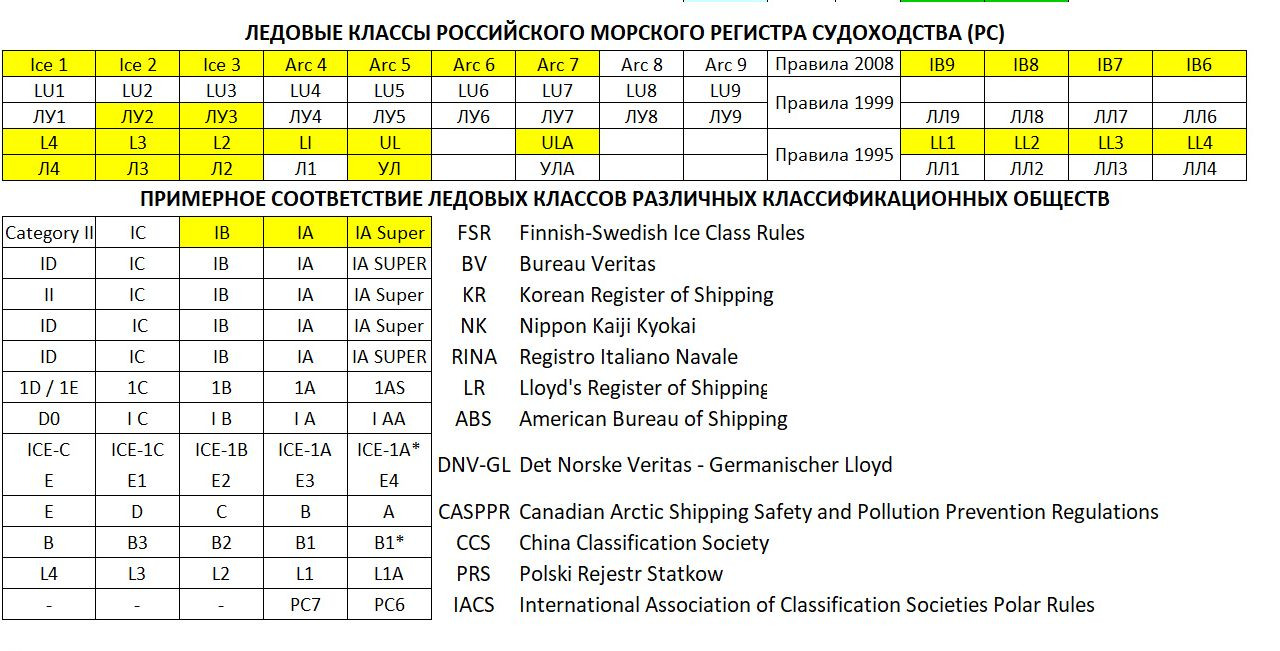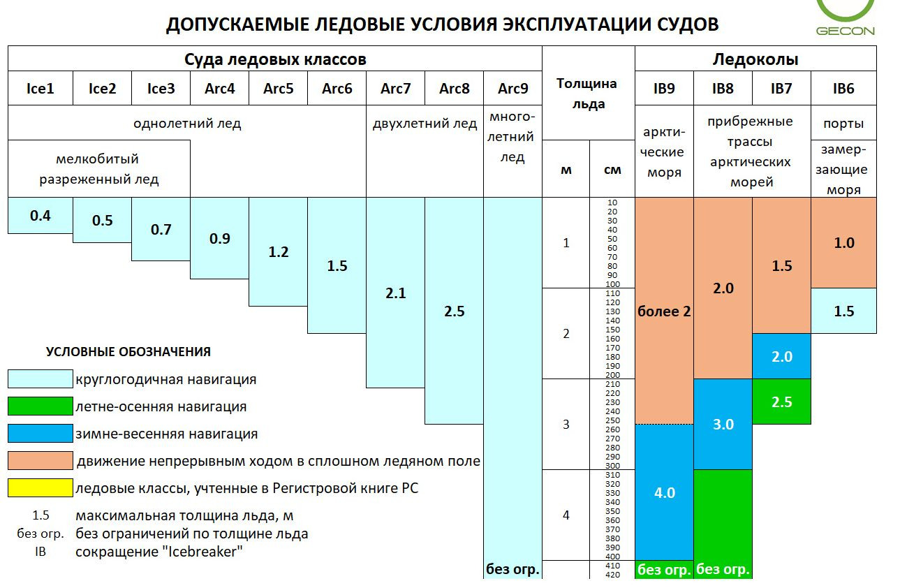 Справочная таблица допускаемых ледовых условий эксплуатации судов и соотношения ледовых классов судов различных классификационных обществ представлена компанией «Гекон».