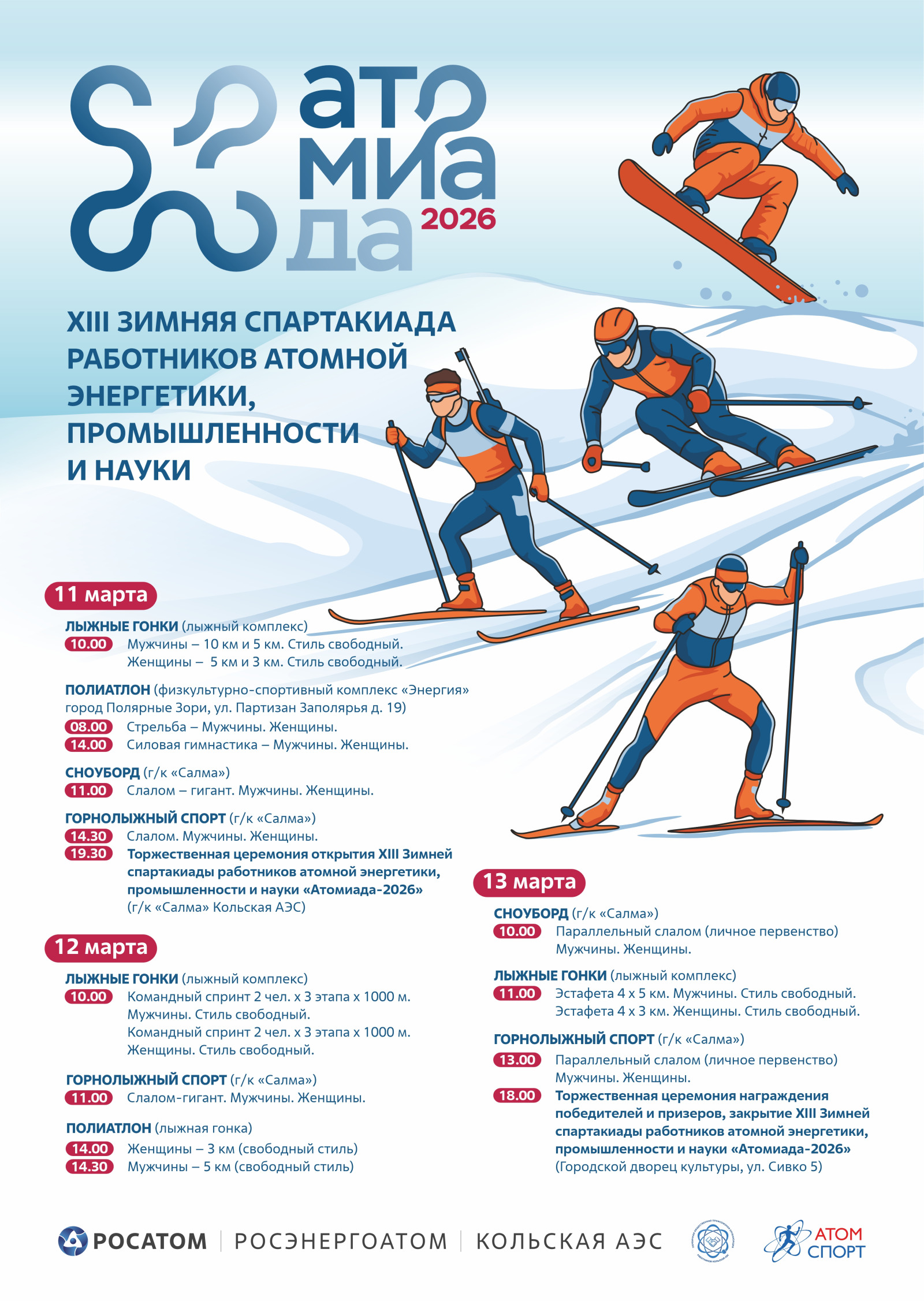 С 11 по 13 марта 2026 г. в городе-спутнике Кольской АЭС Полярные Зори Мурманской области пройдёт XIII Зимняя спартакиада работников атомной энергетики, промышленности и науки «Атомиада - 2026».