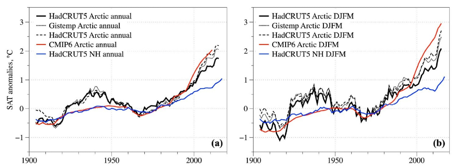 Две волны потепления и арктический разрыв. Графики показывают отклонения приземной температуры воздуха от нормы для Северного полушария и для Арктики, отдельно для среднегодовых значений и для зимы. На них видно два подъема XX века — современное потепление и более ранний всплеск 1920–1940-х, который в Арктике выражен особенно резко. Сопоставление наблюдений с расчетами климатических моделей показывает, что раннее потепление воспроизводится хуже, чем современное