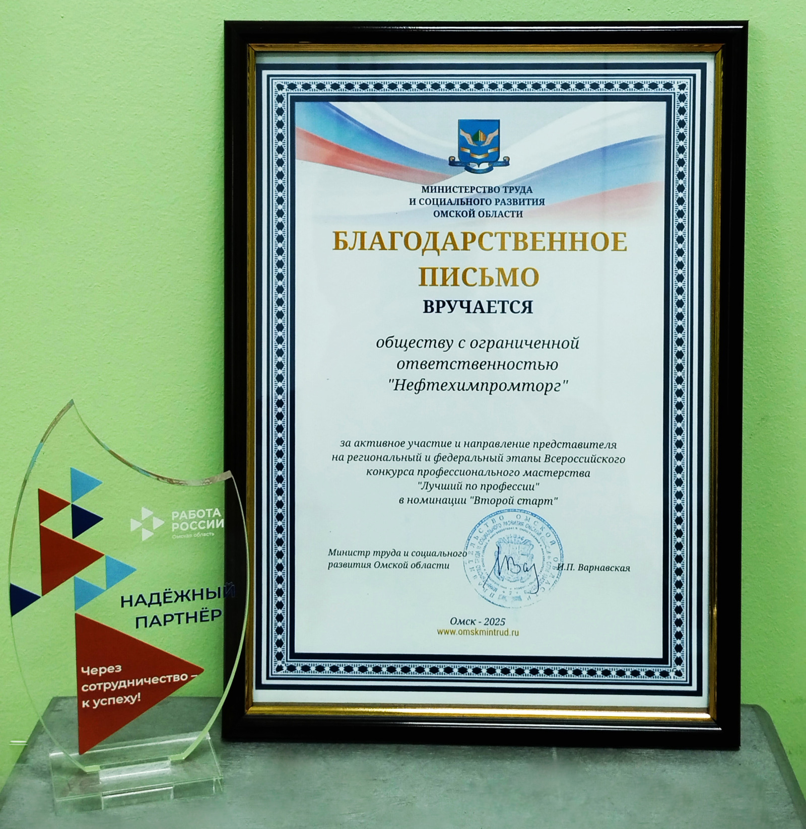 Почетную награду от имени Министерства начальнику отдела управления персоналом завода «НХПТ» Наталье Степановой вручила лично Министр труда и социального развития Омской области Ирина Варнавская.