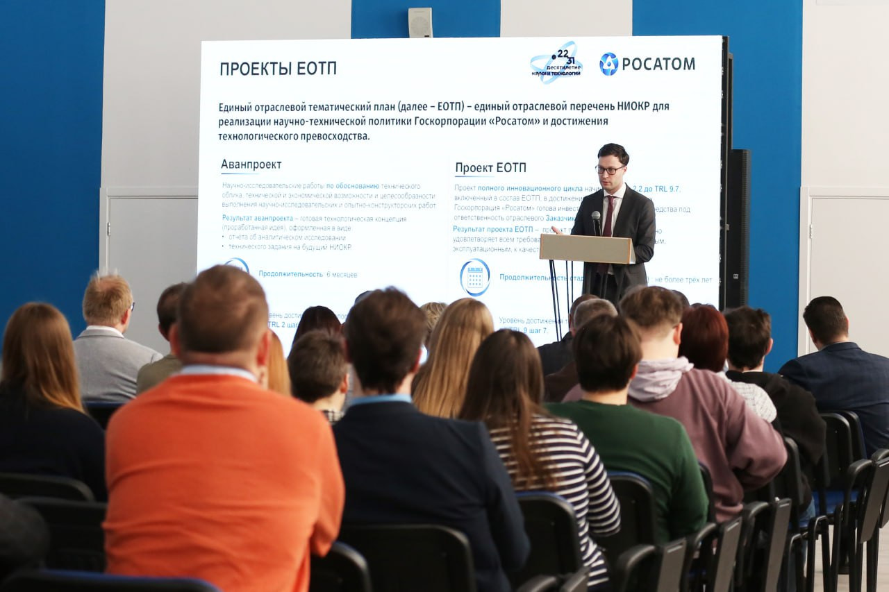 Большой отклик аудитории получил доклад «Управление проектами НИОКР в госкорпорации Росатом» руководителя проектного офиса частного учреждения «Наука и инновации» Дениса Козыря. В своем выступлении он рассказал об этапах реализации проектов ЕОТП и основных направлениях научно-технологического развития атомной отрасли: