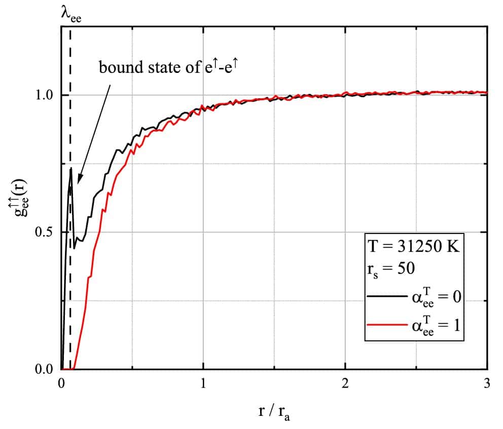 Влияние метода модификации сил на образование кластеров. Черная кривая получена без учета конечной длины волны электрона и демонстрирует аномальный пик — признак образования нефизичного связанного состояния и нарушения принципа Паули. Красная кривая, полученная с модификацией сил, такого пика не имеет, что свидетельствует о предотвращении кластеризации Physics of Plasmas