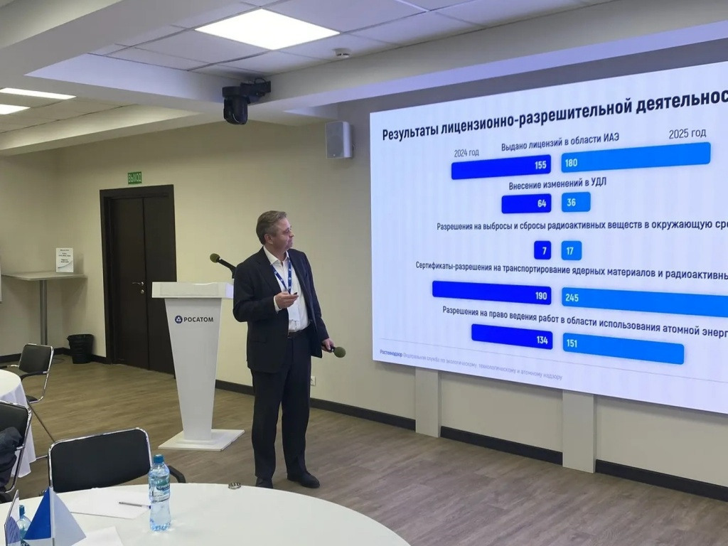 Начальник отдела оценок, лицензирования и инспекций объектов ядерного топливного цикла Михаил Морев выступил с докладом, в котором затронул вопросы регулирования безопасности объектов топливного цикла.