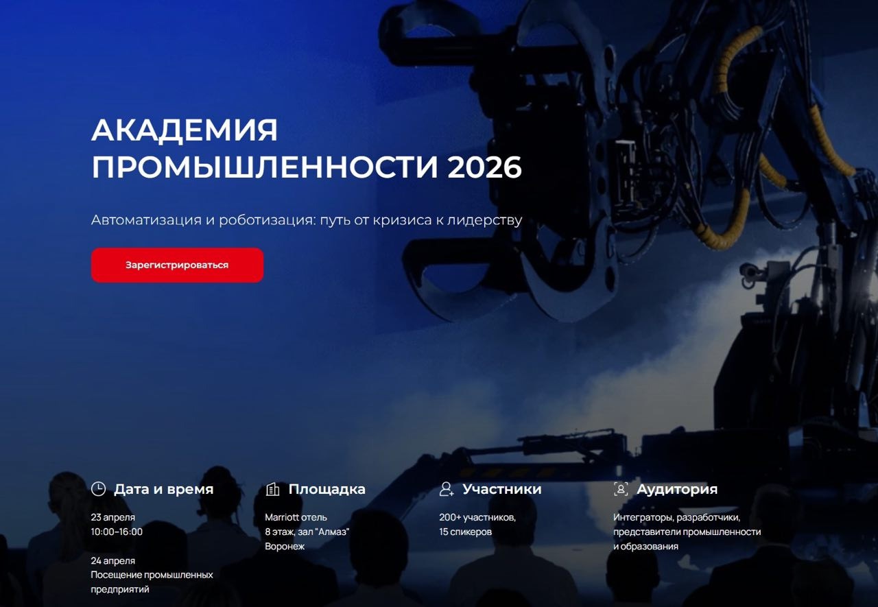 Министерство промышленности и транспорта Воронежской области и МГК «ИНТЕХРОС» 23 и 24 апреля на площадке отеля Marriott проведут конференцию «Академия промышленности. Автоматизация и роботизация: путь от кризиса к лидерству».