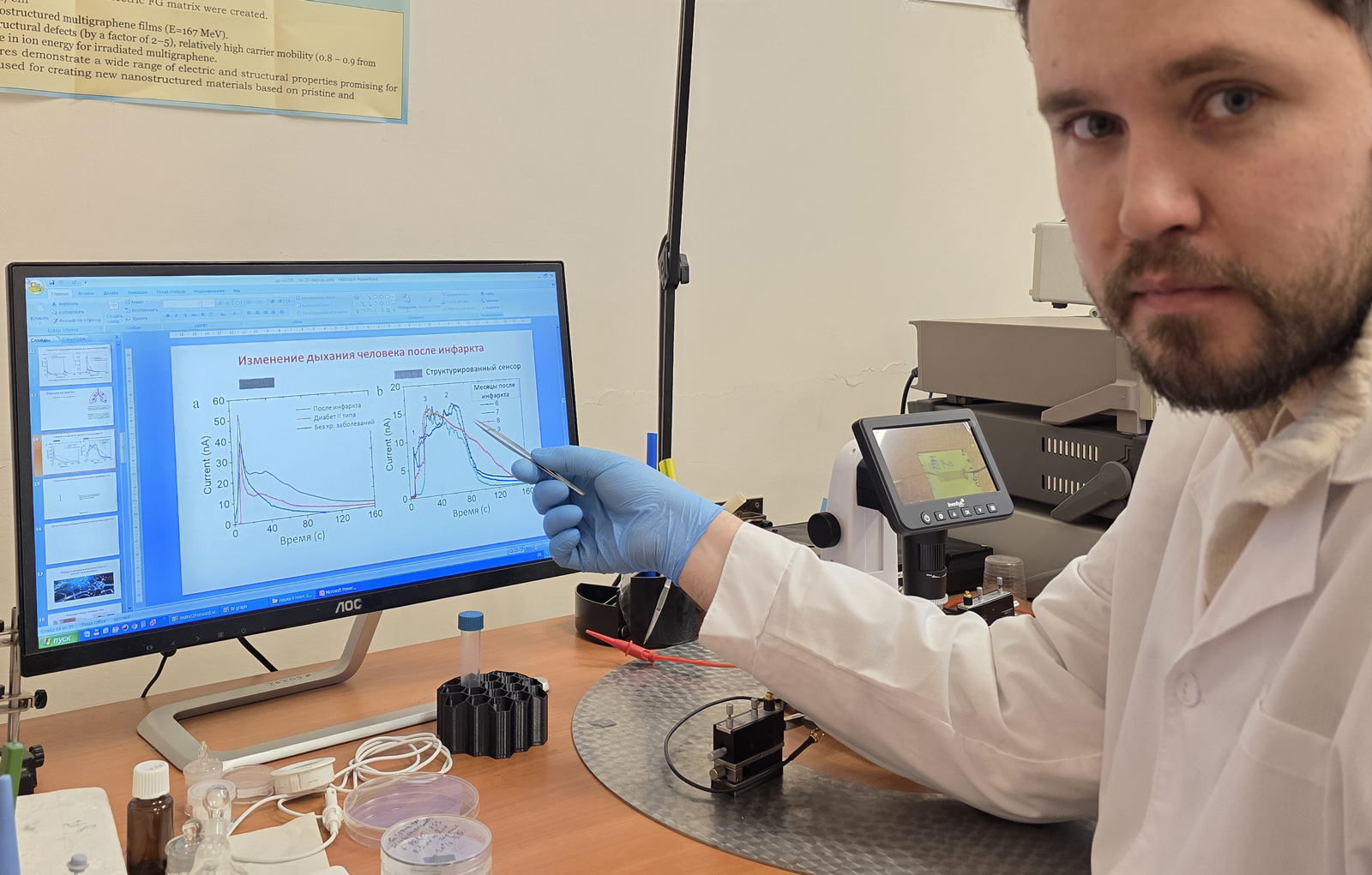 Ученые ИФП СО РАН и ОИВТ РАН разработали датчик на основе графена и полимера, который с высокой точностью анализирует химический состав выдыхаемого воздуха.