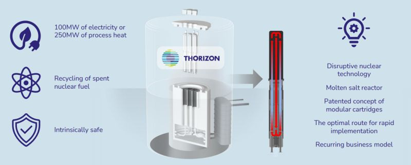 Компания Thorizon разрабатывает жидкосолевой реактор тепловой мощностью 250 МВт / электрической мощностью 100 МВт, ориентированный на крупных промышленных заказчиков и энергетические компании. Принятое Thorizon жидкосолевое топливо использует комбинацию долгоживущих элементов из переработанного отработавшего ядерного топлива и тория. Реактор сможет перерабатывать долгоживущие отходы существующих ядерных объектов. Концепция Thorizon One уникальна тем, что активная зона состоит из набора картриджей, заменяемых каждые пять-десять лет. По словам компании, это позволяет преодолеть два препятствия в конструкции жидкосолевых реакторов: коррозию материалов и обращение с объемами отработавшего топлива.
