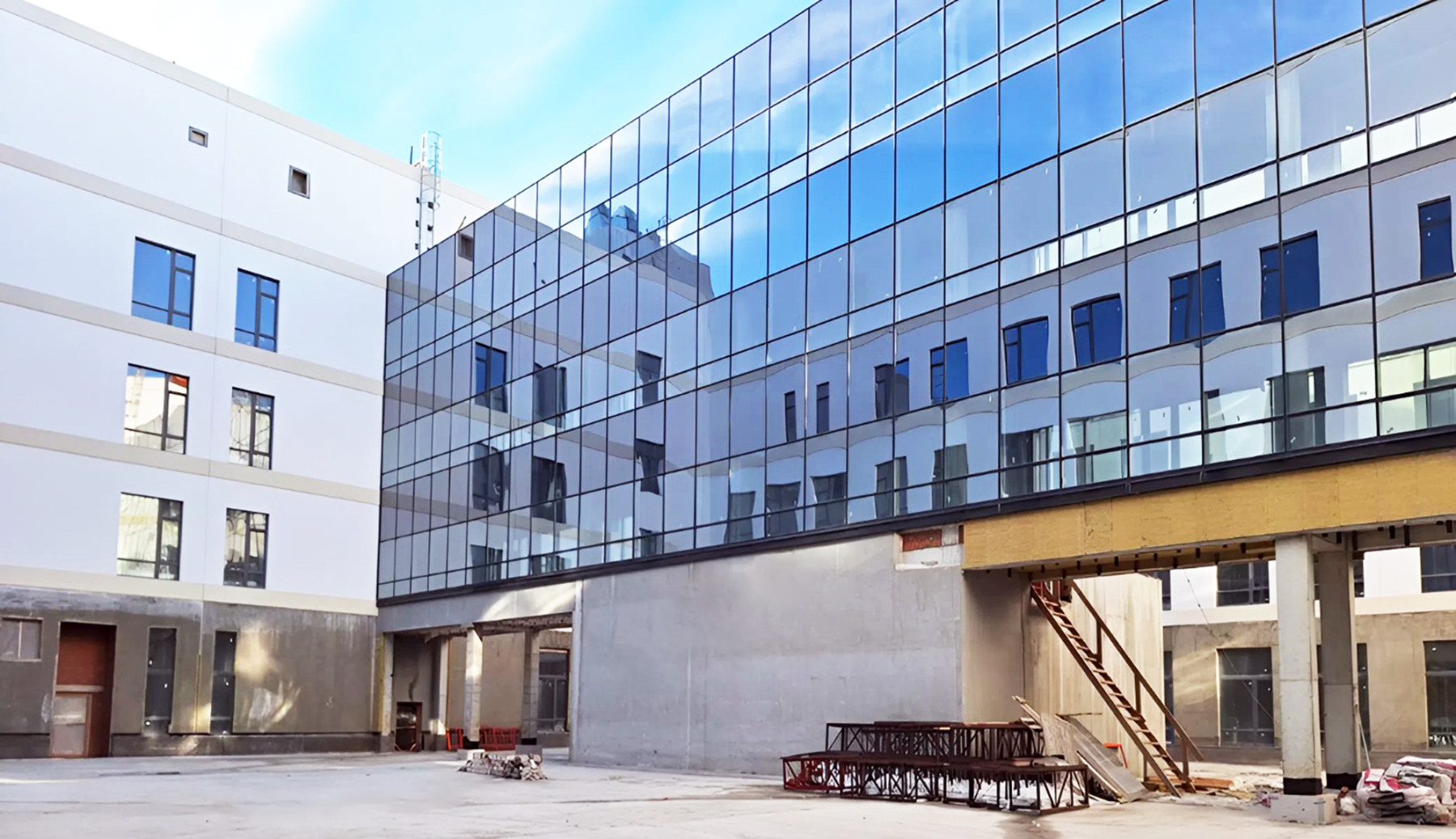 Строительная готовность сооружений превысила 60%. В главном корпусе полностью смонтированы витражи, ведется установка внутренних перегородок, отделочные работы и прокладка инженерных сетей, близки к завершению фасадные работы.