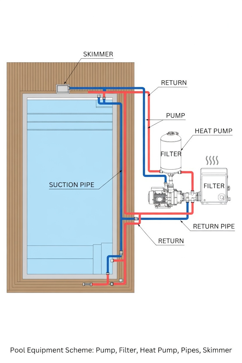 Минимальный комплект: насос, фильтр, скиммер, закладные элементы. Рекомендуемый: дополнительно подогрев, автоматика, освещение, система обеззараживания. Для комфорта — тепловой насос и защитное покрытие.