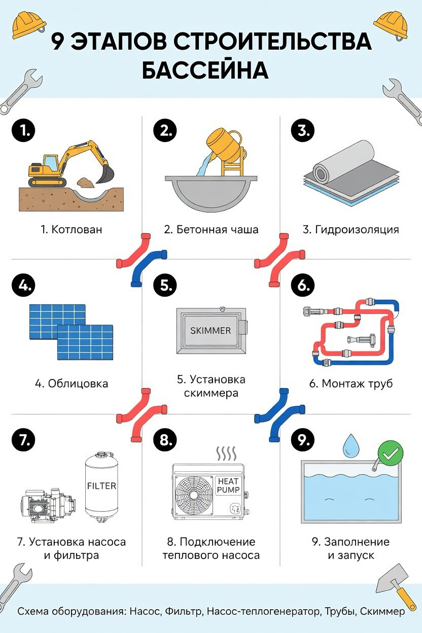 Строительство начинается с оценки участка и выбора места. Затем разрабатывается проект, подбирается оборудование, заключаются договоры с подрядчиками. Основные этапы: земляные работы, монтаж чаши, подключение оборудования, отделка, запуск. Весь процесс занимает от 2 до 12 недель в зависимости от типа бассейна.