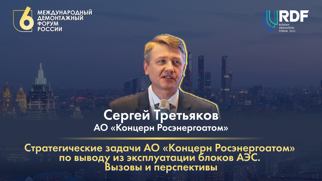 Сергей Третьяков, заместитель директора Департамента по обращению с РАО, ОЯТ и выводу из эксплуатации АЭС – начальник отдела подготовки и вывода из эксплуатации АО «Концерн Росэнергоатом», выступил на 6-м Международом Демонтажном Форуме России с темой «Стратегические задачи АО «Концерн Росэнергоатом» по выводу из эксплуатации блоков АЭС. Вызовы и перспективы».