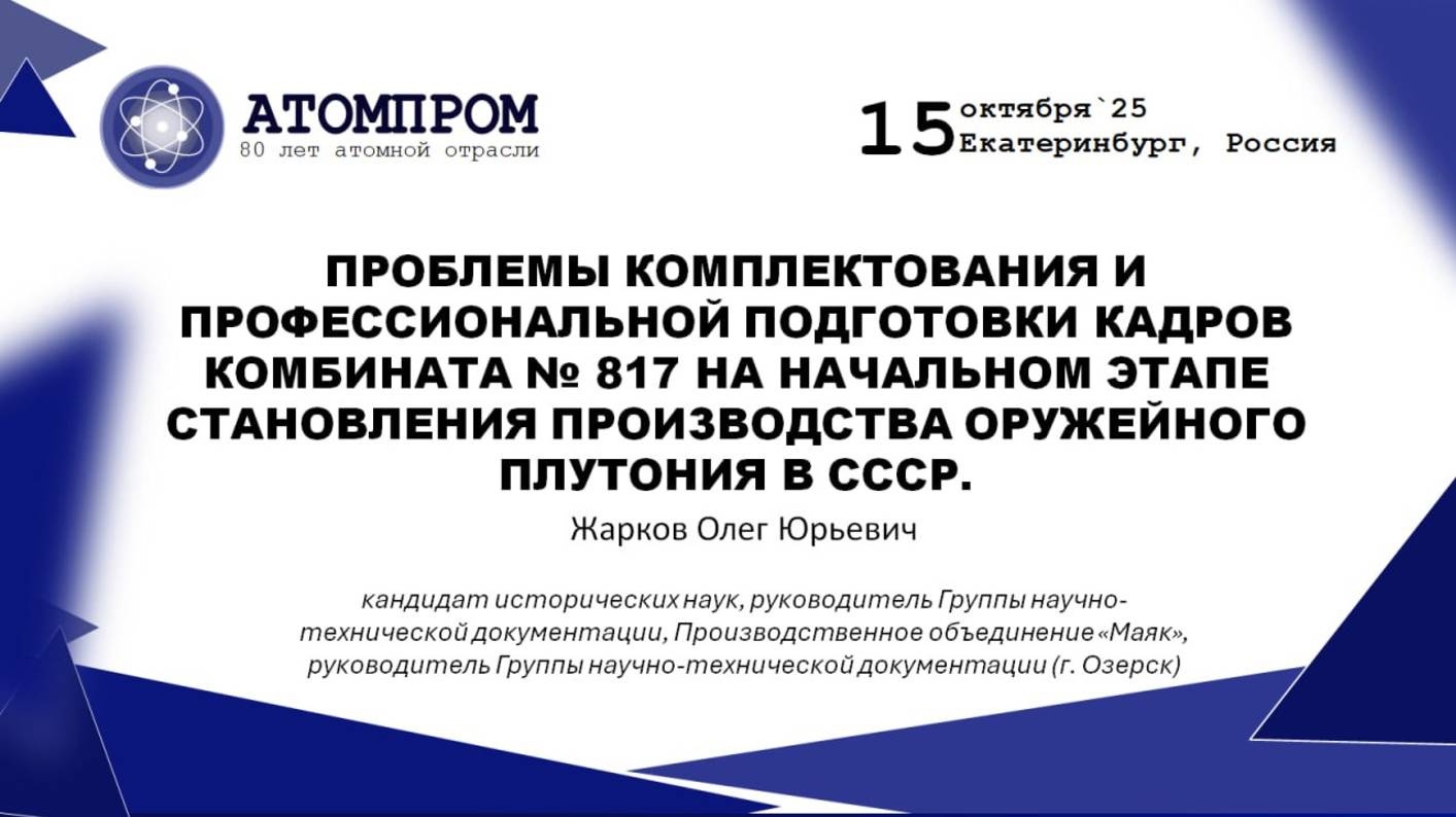 Жарков Олег Юрьевич, кандидат исторических наук, руководитель Группы научно-технической документации, Производственное объединение «Маяк».